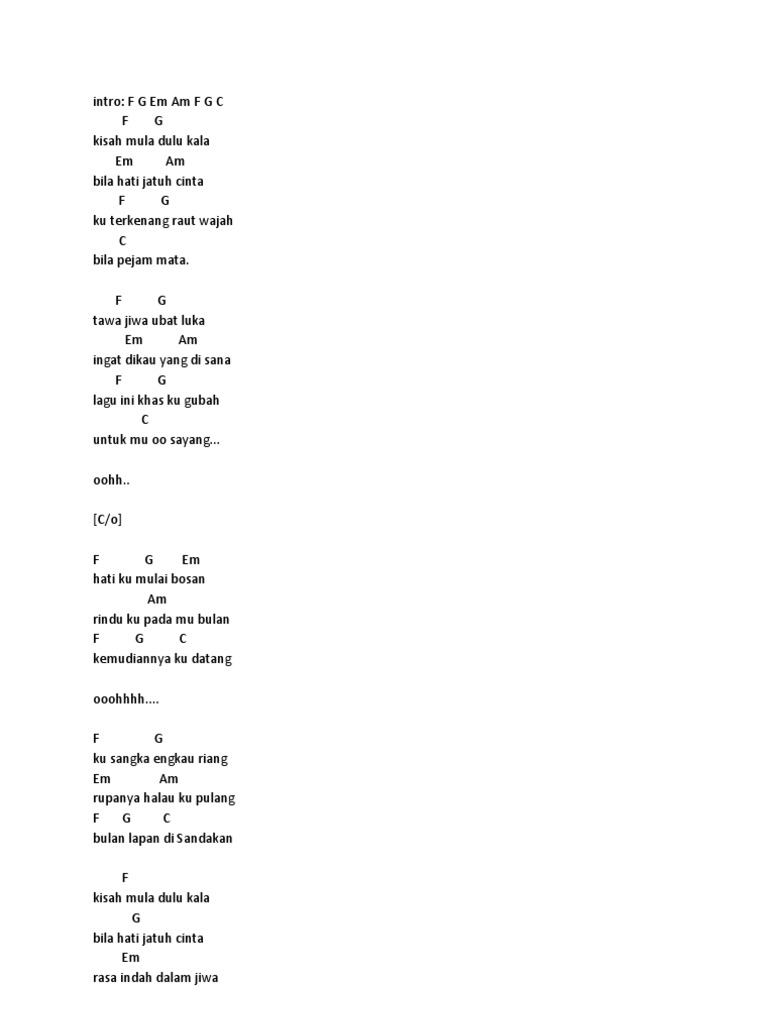 Make strumming patterns to the song using. F G kisah mula dulu kala Em Am bila hati jatuh cinta F G ku terkenang raut wajah Em Am bila pejam mata F G tawar jiwa ubat duka Em Am ingat dikau yang disana F G lagu ini khas ku gubah C untuk mu oh sayang Am F G Em oh hatiku mulai bosan Am F rindu ku padamu. Search results for The Batalion - Bulan 8 Di Sandakan - Malay Gitar Kord Tab Chords Easy Chord Lyrics.